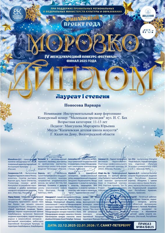 Поздравляем Поносову Варвару и Батраева Дениса (преподаватель Мангушева Маргарита Юрьевна) с победой в IV Международном конкурсе-фестивале "Морозко" (финальный проект 2025 года)